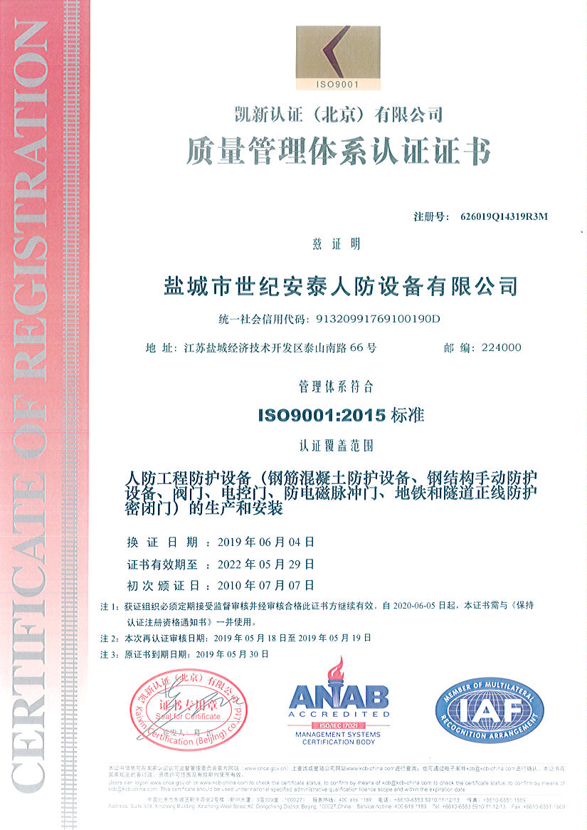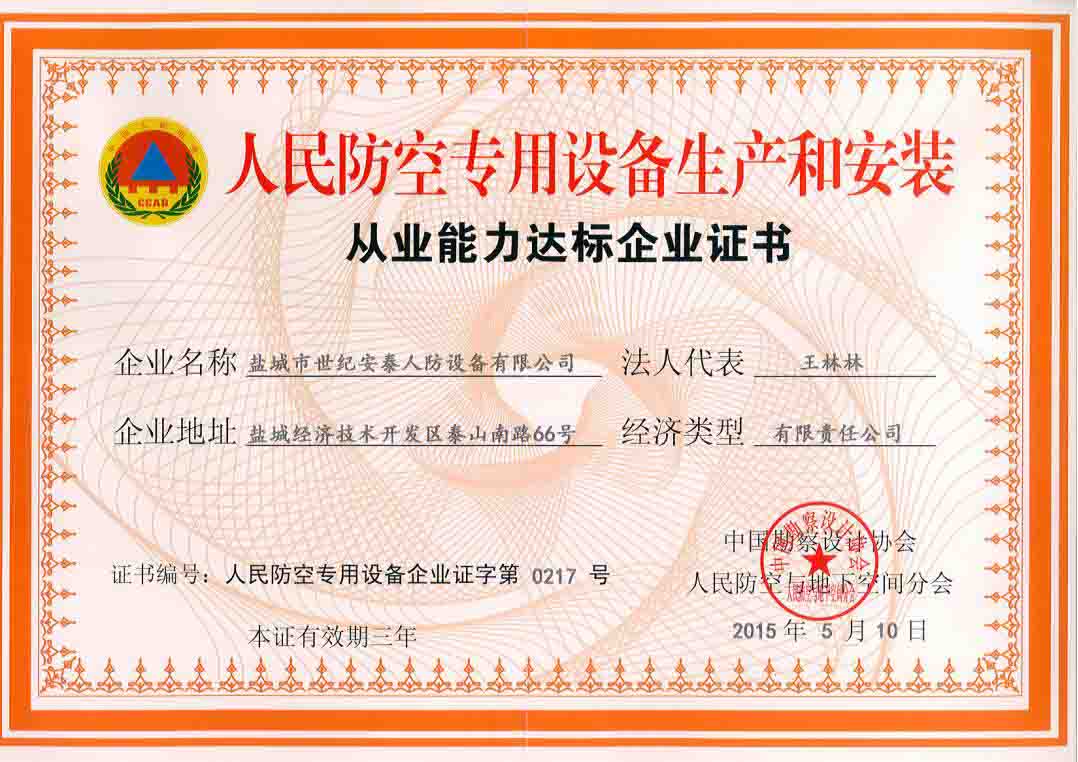 鹽城市世紀(jì)安泰人防設(shè)備有限公司是國家人民防空辦公室批準(zhǔn)成立的人防工程防護(hù)設(shè)備定點(diǎn)生產(chǎn)和安裝企業(yè),是專業(yè)生產(chǎn)、銷售、安裝人防防護(hù)設(shè)備產(chǎn)品的企業(yè),公司主要生產(chǎn)鋼筋混凝土防護(hù)設(shè)備、鋼結(jié)構(gòu)手動(dòng)防護(hù)設(shè)備、閥門、電控門、防電磁脈沖門、地鐵和隧道正線防護(hù)密閉門等各類產(chǎn)品并對(duì)產(chǎn)品進(jìn)行安裝、調(diào)試、維修及保養(yǎng),公司生產(chǎn)的各種規(guī)格的人防工程產(chǎn)品,均按國家人防總參工程兵四所及中國建筑標(biāo)準(zhǔn)設(shè)計(jì)研究院提供的圖紙生產(chǎn),符合各種人防工程設(shè)計(jì)要求,是各類地下人防工程選用的理想產(chǎn)品。本公司已通過GB/T19001-2008IDT ISO9001:2008國家質(zhì)量體系認(rèn)證。